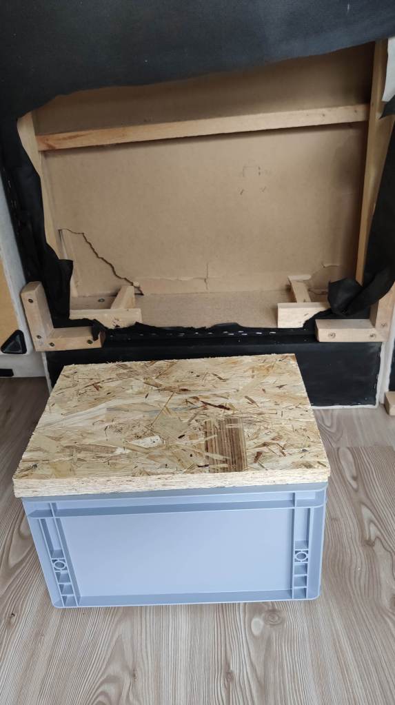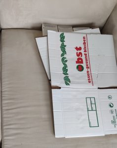 Dann, im Gespräch mit meiner Freundin, die Idee: Der Abstand vom Boden zum “Federhaltekarton” war ja genau 25 cm… Wenn ich also eine Kiste, egal ob Holz oder Kunststoff, da drunter rein bring, wird das das Gewicht sicher auch stützen können!